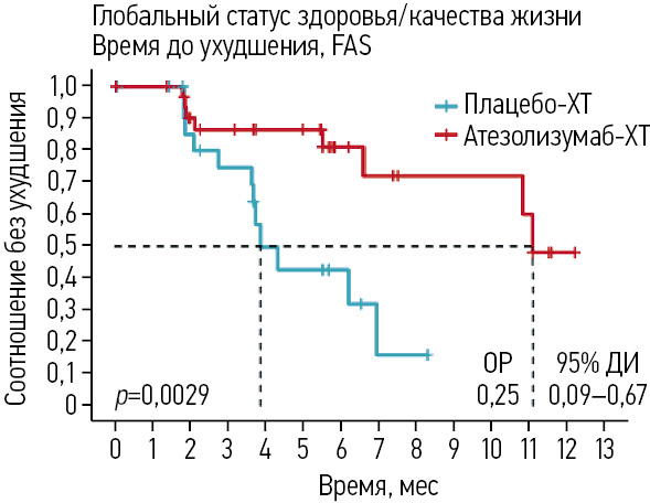 Химиоиммунотерапия с атезолизумабом не привела к значимому увеличению ОВ в исследовании ALICE, но способствовала существенному продлению времени до ухудшения качества жизни (рис. 19) [20, 21].