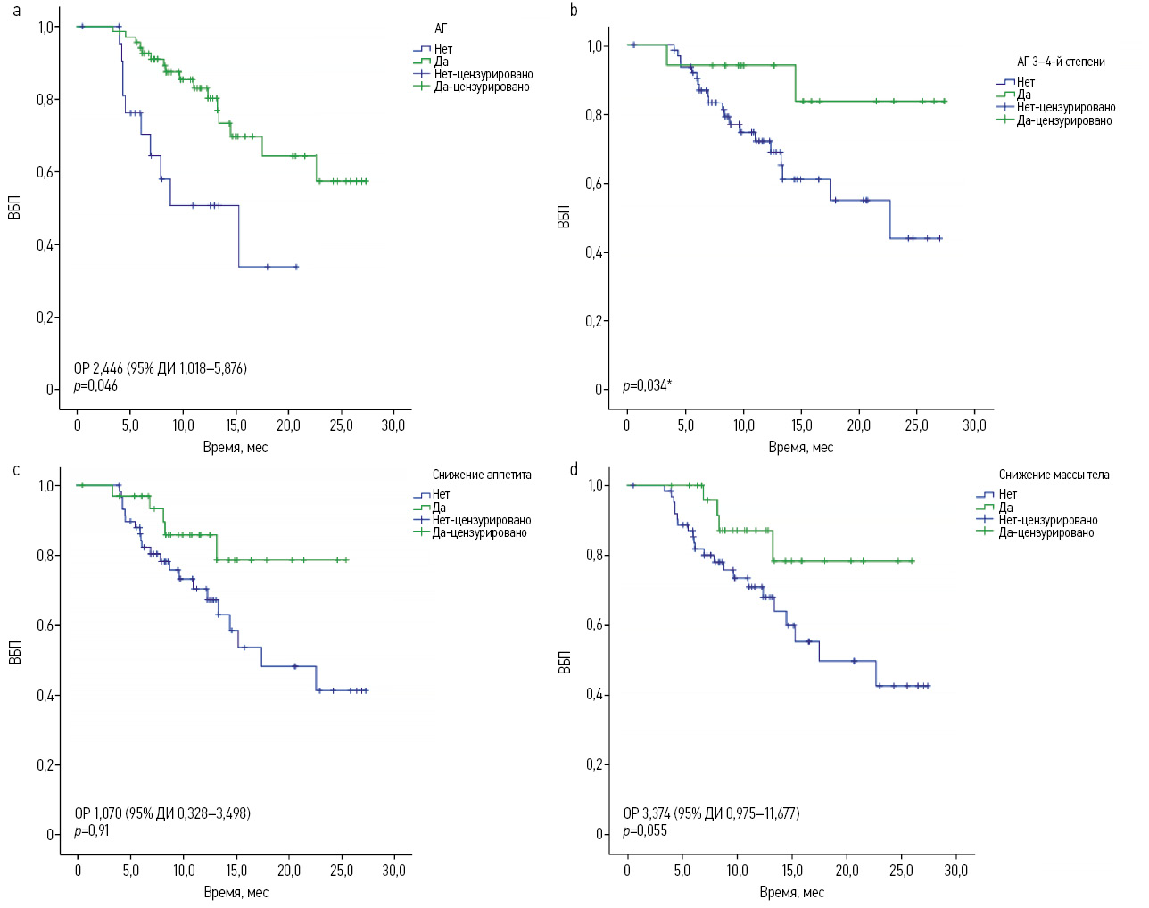 Рис. 1. ВБП больных распространенным ПКР в зависимости от развития НЯ на фоне терапии кабозантинибом: a – АГ; b – АГ 3–4-й степени (*по данным однофакторного анализа); c – снижения аппетита; d – снижения массы тела.