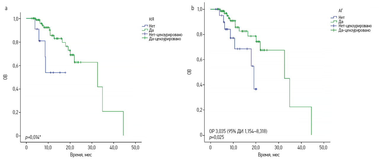 Рис. 2. ОВ больных распространенным ПКР в зависимости от развития НЯ на фоне терапии кабозантинибом: a – любых НЯ (*по данным однофакторного анализа); b – АГ.