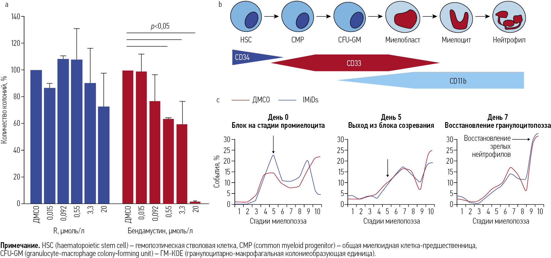 Рис. 1. IMiDs индуцируют обратимую остановку созревания клеток миелоидного ряда, тогда как алкилирующие цитостатики их необратимо повреждают: а – подавление образования колоний CD34+ клетками костного мозга здоровых доноров бендамустином (красные столбики); b – схематическая диаграмма демонстрирует 10 стадий миелоидной дифференцировки от гемопоэтической стволовой клетки до зрелого нейтрофила; c – влияние культивирования с IMiDs в эксперименте in vitro. Адаптировано из [21].