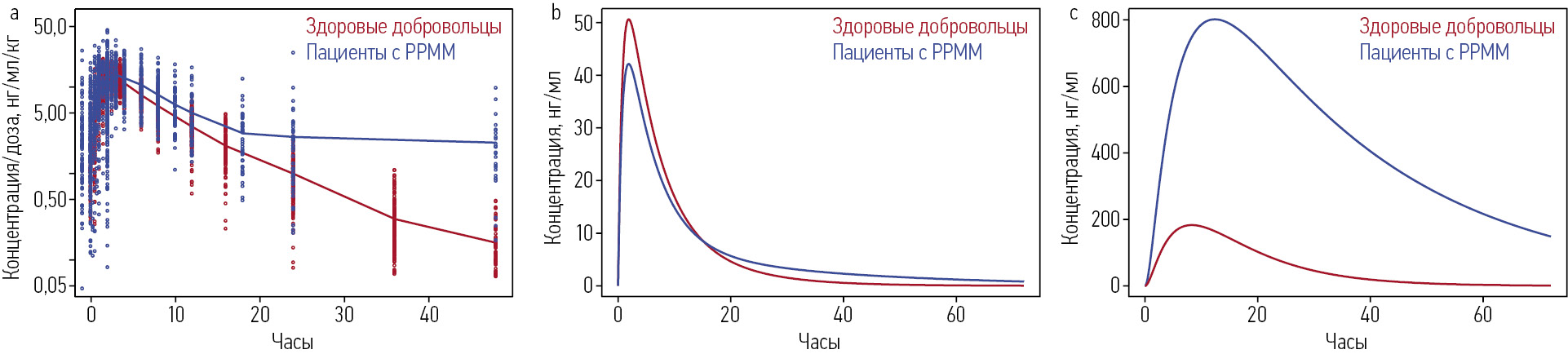 Рис. 2. Дозово-временная концентрация помалидомида у здоровых добровольцев и пациентов с РРММ [30]: a – индивидуальная нормированная к дозе концентрация; b – концентрация помалидомида в плазме; c – концентрация помалидомида в периферическая тканях и органах.
