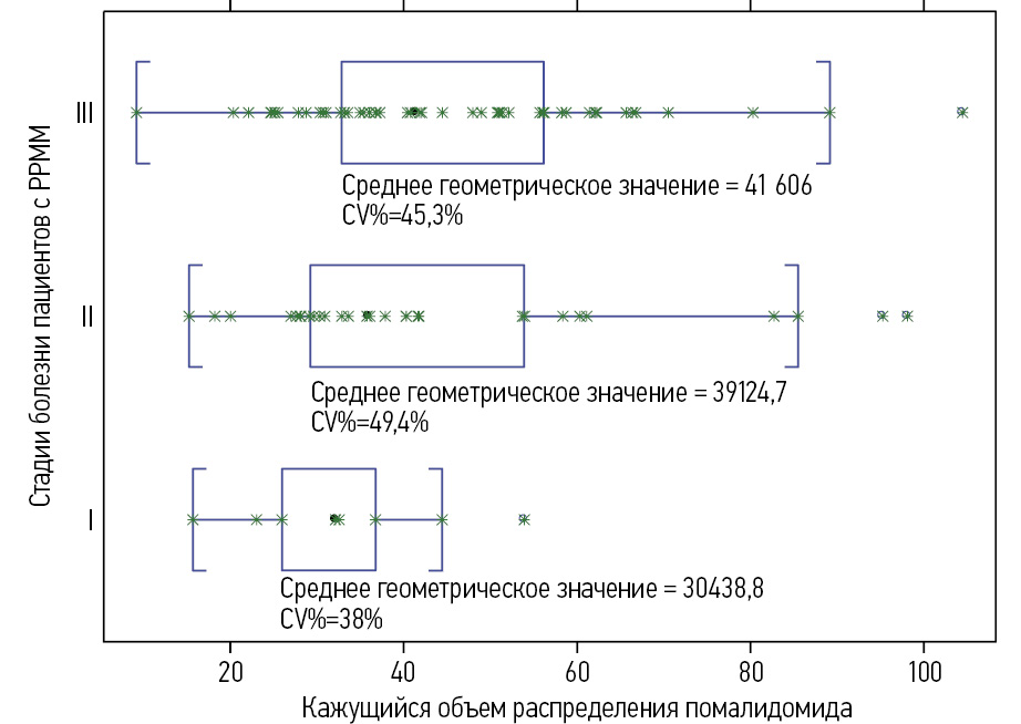 Рис. 3. Корреляция между воздействием помалидомида на периферические ткани и стадией заболевания у пациентов с РРММ (график в виде прямоугольников и усов; цитируется по [30]).