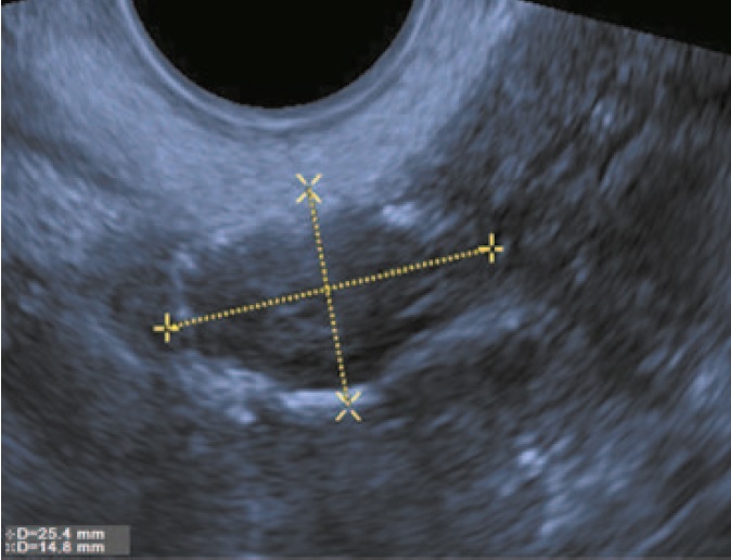 Fig. 3. The application of transvaginal sonographic elastography. The ultrasound image showing the normal sized ovary. The structure of the ovary contains thin-walled cystic lesion with clear anechoic contents. A 0.4 cm thick papillary structures lesion along the cyst wall is visualized.