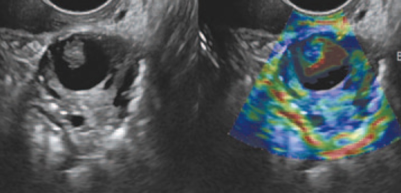 Рис. 3. Трансвагинальное УЗИ с использованием эластографии. На изображении неувеличенный яичник. В его структуре определяется тонкостенное кистозное образование с прозрачным анэхогенным содержимым. Пристеночно визуализируются сосочковые структуры толщиной 0,4 см.