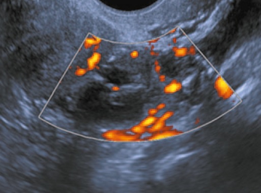 Fig. 2. Transvaginal ultrasound. The color doppler imaging demonstrates the vascular pattern in the papillary growth pattern.