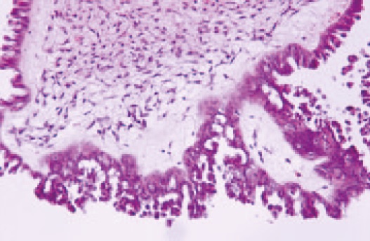Больной выполнена операция в объеме лапаротомии, экстирпации матки с правыми придатками. Удаление большого сальника. Правый яичник был представлен двухкамерным образованием размерами 3–4 см, на внутренней поверхности меньшей камеры определялись наложения в виде сгустков крови, поверхность кисты была гладкая, розовая, на внутренней поверхности большей камеры – плоского вида сосочковые разрастания желтоватого цвета толщиной до 3 мм плотноватой консистенции. При гистологическом исследовании удаленных правых придатков матки обнаружена высокодифференцированная серозная папиллярная аденокарцинома. Препараты 1 и 2-й операций были повторно пересмотрены. Оказалось, что и в левом яичнике, удаленном ранее при первой операции, определялся рак low grade. Первоначально он не был распознан (рис. 4).