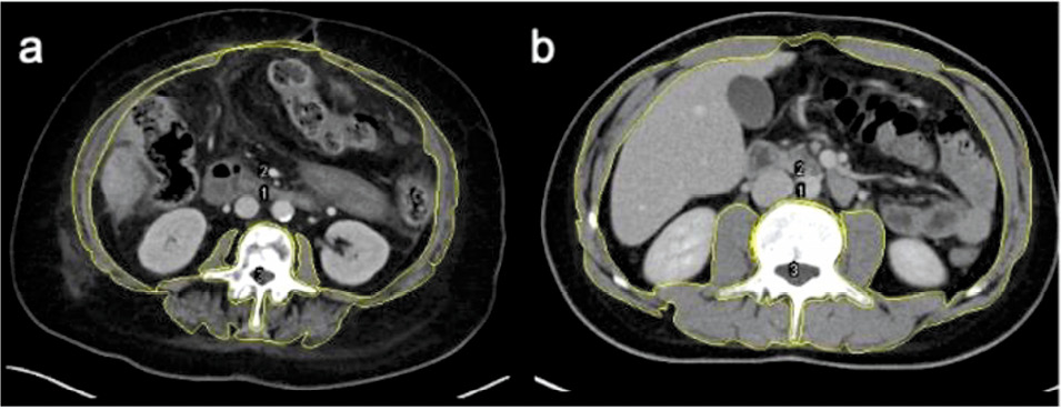 В настоящее время в клинической практике для диагнос- тики саркопении чаще всего используется метод КТ, позволяющий оценить площадь мышц и их качественное состояние. Для диагностики чаще всего выбирается уровень LIII позвонка (рис. 1). После контурирования (желтый цвет) внешнего (1) и внутреннего (2) периметров скелетной мышцы, а также III поясничного позвонка (3) площадь скелетных мышц можно рассчитать, используя математические уравнения. Показанные на рис. 1 анализируемые области являются показательными для пациента с низкой (а) и высокой (b) мышечной массой [19].
