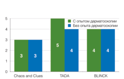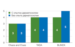 Следовательно, учитывая полученные результаты, можно сделать вывод, что изучаемые алгоритмы могут применяться в диагностике ЗНО кожи. При этом лицам, не имеющим опыта дерматоскопии, рекомендуется использовать алгоритм Chaos and Clues (для этой группы чувствительность – 93,75±3,3%; специфичность – 62,3±5,7%), как минимум в случаях сомнения в доброкачественности образования; алгоритм TADA (чувствительность в данной группе – 84,4±4,6%; специфичность – 64,2±5,8%) и методика BLINCK (чувствительность – 80,6±4,4%; специфичность – 77,4±4,6%) могут быть использованы в случае отсутствия сомнений в доброкачественности новообразования кожи. Таким образом, несмотря на невысокие субъективные оценки критериев «скорость» и «удобство» (по 3 балла из 5 возможных каждый), алгоритм Chaos and Clues должен являться приоритетным выбором для врача с небольшим опытом дерматоскопии.