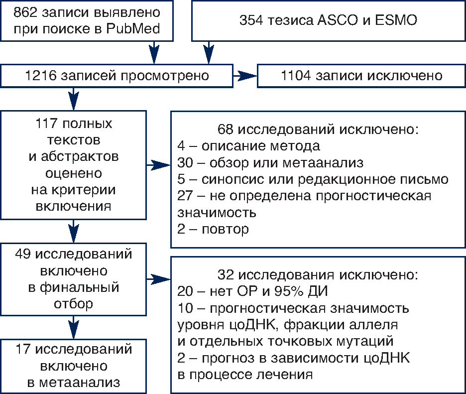 Названия и абстракты статей просмотрены двумя независимыми онкологами для выявления исследований, которые потенциально могли бы соответствовать критериям включения и исключения. Критериями включения в метаанализ были полнотекстовые статьи и тезисы на русском и английском языках, опубликованные до февраля 2020 г., содержащие информацию о частоте выявления цоДНК в крови и ее связи с выживаемостью без признаков заболевания (ВБПЗ) и общей выживаемостью (ОВ) пациентов. В исследование не включали обзоры литературы, редакционные статьи, дизайны исследования, описание молекулярно-генетического метода и другие публикации, не содержащие собственных результатов. Также к критериям исключения относили: