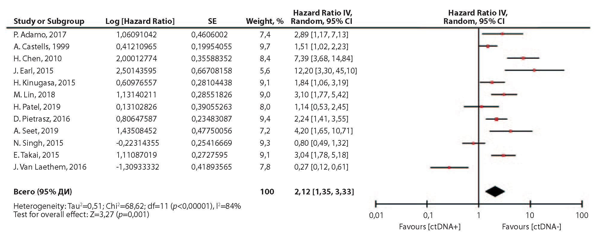 Materials and methods. We carried out the search for the articles and abstracts in PubMed, ASCO and ESMO databases published before February 2020, containing data about the connection between ctDNA and the prognosis of pancreatic cancer. The exclusion criteria were the studies including 10 or less participating patients, absence of the data about the relative risk of mortality and/or progression, and the 95% confidence interval. The meta-analysis was carried out by using the Review Manager software (RevMan), Version 5.3.