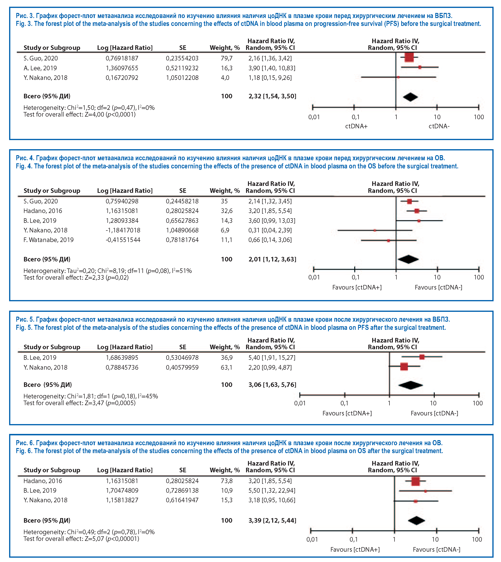 Согласно результатам проведенного нами метаанализа наличие цоДНК до начала лечения вне зависимости от распространенности заболевания увеличивало риск смерти пациентов в 2 раза (ОР 2,21, 95% ДИ 1,35–3,33, р=0,001). В случае резектабельного процесса выявление цоДНК как до, так и после хирургического лечения негативно влияло на ВБПЗ (ОР 2,32, 95% ДИ 1,54–3,5, р<0,0001 и ОР 3,06, 95% ДИ 1,63–5,76, р=0,0005 соответственно) и ОВ (ОР 2,01, 95% ДИ 1,12–3,63, р=0,02 и ОР 3,39, 95% ДИ 2,12–5,44, р<0,00001 соответственно) пациентов. Ранее проведенные метаанализы подтвердили, что цоДНК является важным прогностическим фактором [27, 28]. Но к их недостаткам можно отнести малое количество и гетерогенность включенных исследований, отсутствие анализа значимости цоДНК, обнаруженной в крови пациентов до и после хирургического лечения. Последнему вопросу посвящен 1 метаанализ, включивший работы, опубликованные до марта 2019 г. [20], однако наш анализ включил результаты 3 новых исследований.