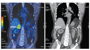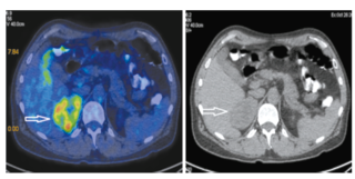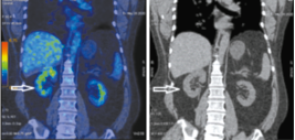 Из анамнеза известно, что на протяжении последних 5 лет он стал отмечать повышение артериального давления до 170/100 мм рт. ст., по поводу чего получал консервативное лечение, а также проходил ежегодные обследования, включая ультразвуковое исследование органов брюшной полости и малого таза. При компьютерной томографии (КТ) органов брюшной полости с контрастированием в правом надпочечнике определяется патологическое объемное образование размером 48×49×75 мм неоднородной структуры и плотности. Для определения степени распространенности опухолевого процесса выполнена комбинированная позитронно-эмиссионная и рентгеновская КТ (ПЭТ/КТ).