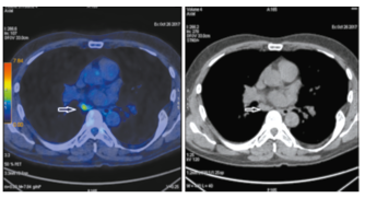 Fig. 3. A 52-year-old patient U. PET/CT (a) and CT images in axial projection (b). A 17×11×24 mm mass (arrow) at the inferior wall of the right main bronchus, SUVmax 7.25.