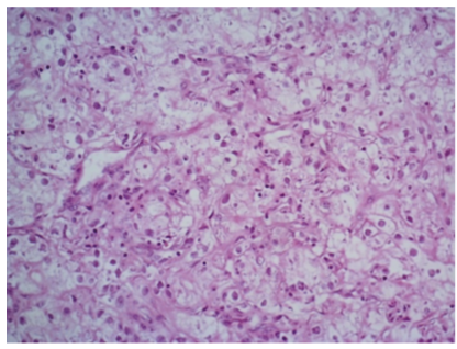 Fig. 5. Photomicrograph. Metastasis of clear-cell renal cell carcinoma. Tumor cells associated with significant nuclear polymorphism, prominent nucleoli, optically empty cytoplasm. Hematoxylin and eosin staining, ×200.