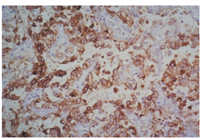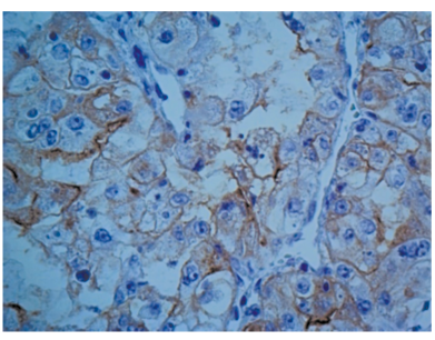 Рис. 7. Иммуногистохимия. Положительная мембранная экспрессия кальцитонина в опухолевых клетках, х200.