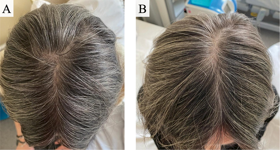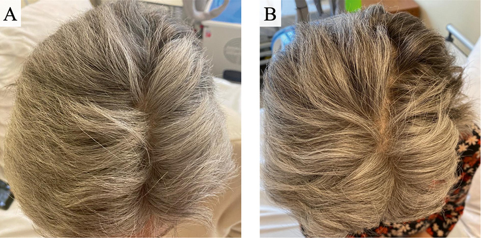 На рис. 1–3 наглядно продемонстрировано состояние волосяного покрова головы у пациенток, получающих ПЛТ и процедуры профилактической ГКГ на аппарате Orbis II. Отмечается незначительная потеря волос, в общем объеме составляющая менее 50%, что соответствует алопеции 1-й степени согласно критериям CTCAE v5.0.