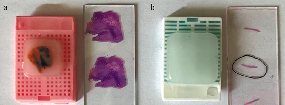 Рис. 1. Сравнение эксцизионной биопсии (a) и cor-биопсии (b). Фото предоставлено Я.К. Мангасаровой, канд. мед. наук, ФГБУ «НМИЦ гематологии» Минздрава России.