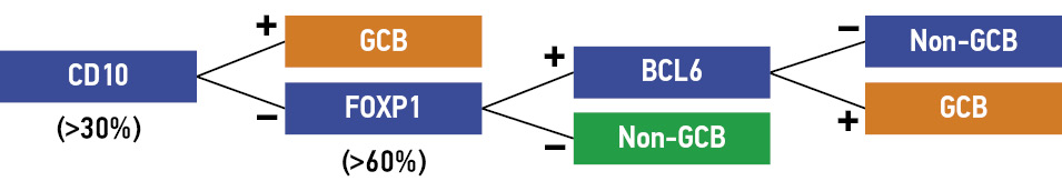 Основным ограничением традиционного GEP была необходимость использовать для исследования свежие или замороженные образцы опухолевой ткани, которые доступны у небольшого числа пациентов. Поэтому предпринималось множество попыток найти возможность диагностики подтипов ДВККЛ по COO посредством ИГХ-маркеров. Среди нескольких предложенных алгоритмов самое широкое применение нашел алгоритм C. Hans и соавт. [17] и W. Choi и соавт. 2009 г. [25].