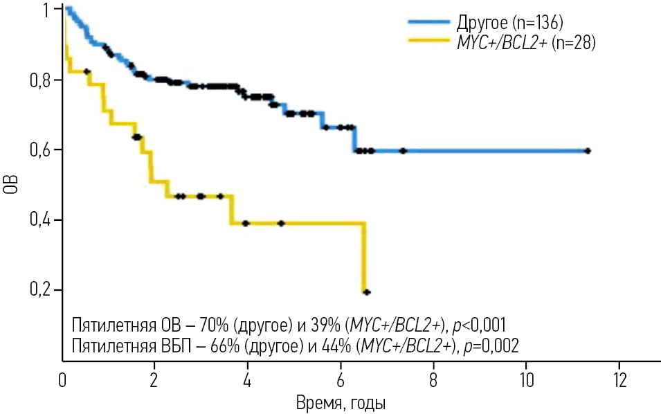 Единовременная гиперэкспрессия MYC и BCL2, наблюдающаяся приблизительно в 30% случаев ДВККЛ, называется DEL. Данный вариант ассоциирован с более неблагоприятным прогнозом, чем гиперэкспрессия любого из этих маркеров в отдельности. Лимфома с коэкспрессией MYC и BCL2 не является уникальной биологической сущностью, встречается при подтипах GCB и ABC, но все-таки чаще при ABC, что может частично определять прогностические последствия (рис. 5) [20]. Предпочтительная терапевтическая стратегия при DEL не определена.