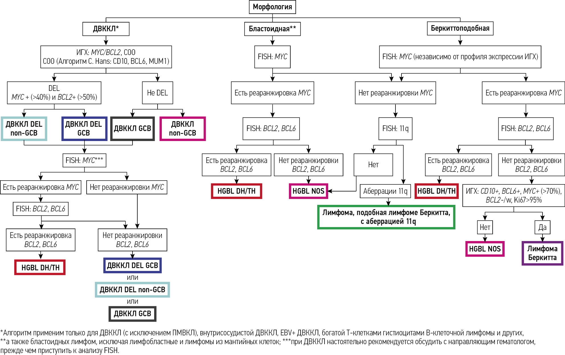 Прежде чем приступить к FISH-анализу согласно практическому диагностическому алгоритму, предложенному A. Di Napoli и соавт. [51], в случаях ДВККЛ рекомендуется обсудить с направляющим клиницистом-гематологом результаты ИГХ-скрининга, чтобы подтвердить потенциальную возможность использования в данном случае высокоинтенсивных подходов индукционной химиоиммунотерапии по поводу HGBL DH/TH [51]. Анализ FISH следует выполнять в любом случае при лимфомах с бластоидной морфологией или с морфологическими промежуточными признаками между ДВККЛ и лимфомой Беркитта.