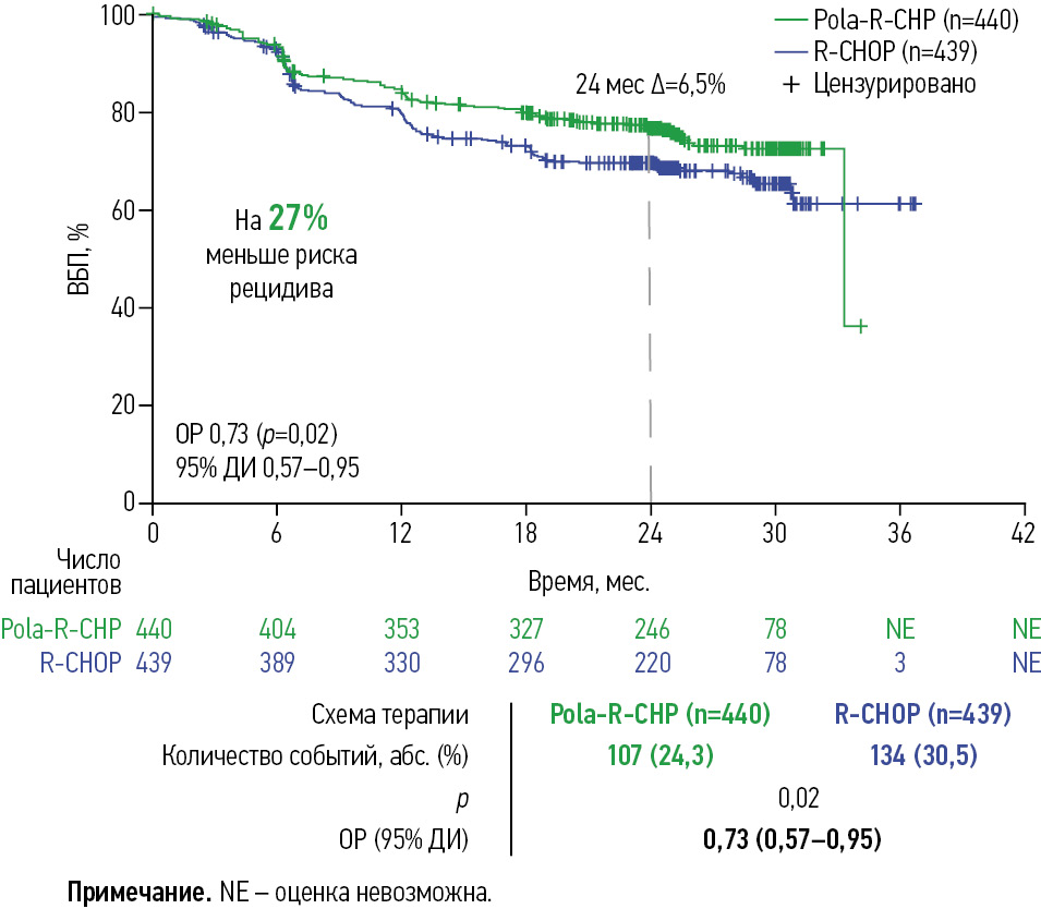 На момент среза данных (28 июня 2021 г.), при медиане наблюдения 28,2 мес., количество зарегистрированных событий (рецидив, прогрессия, летальный исход) в группе Pola-R-CHP составило 107 (24,3%) в сравнении со 134 (30,5%) в группе R-CHOP (p=0,02), что соответствовало снижению риска прогрессирования и смерти в общей популяции пациентов исследования на 27% при включении полатузумаба ведотина в режим 1-й линии терапии ДВККЛ (рис. 3).