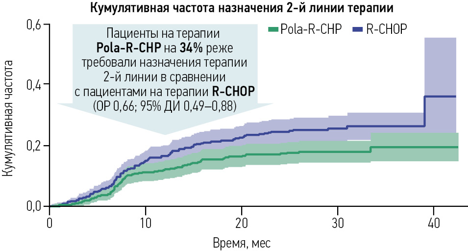 Одним из наиболее важных показателей эффективности терапии 1-й линии ДВККЛ является снижение необходимости назначать последующее лечение. В связи с прогрессированием заболевания 78 (17%) пациентам, получавшим Pola-R-CHP, и 109 (25%) из группы R-CHOP за время наблюдения назначена следующая линия лечения. Таким образом, полатузумаб ведотин позволил снизить риск на 34%, а кумулятивная частота перехода на 2-ю линию в течение 24 мес. составила 17,1% против 24,4% соответственно (рис. 4) [40].