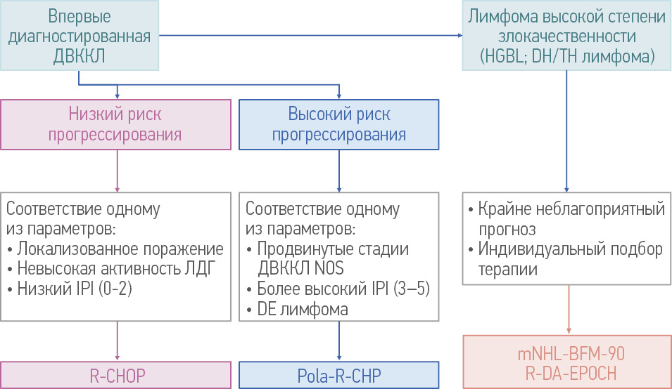 Стратификация риска и алгоритмы лечения различаются в зависимости от стадии заболевания и объема опухолевой массы наряду с дополнительными клиническими и биологическими факторами, такими как Международный прогностический индекс (IPI), клеточное происхождение (COO), двойная экспрессия MYC и BCL2 и другие молекулярные особенности. Наиболее распространенным режимом терапии, применяемым сегодня в качестве 1-й линии при ДВККЛ NOS, является R-CHOP (ритуксимаб, циклофосфамид, доксорубицин, винкристин и преднизолон), который позволяет достичь длительных ремиссий примерно в 60–70% случаев. Неудовлетворительные показатели эффективности при использовании этой опции обусловлены в первую очередь прогнозом – промежуточный и высокий риск раннего прогрессирования согласно индексу IPI (3–5 баллов), подтип ДВККЛ из активированных лимфоцитов (АВС), а также наличие двойной экспрессии (DEL) белков MYC и BCL2 в опухоли.