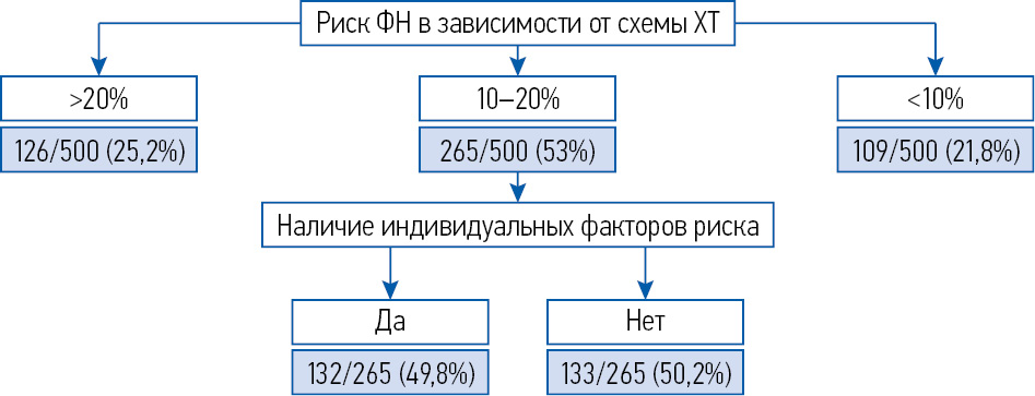 Results. CT regimens with a high (>20%) risk of FN were received by 25.2% (126/500) of patients; 53% (265/500) of patients had intermediate risk, and half of them (132/265 [49.8%]) had at least one additional risk FN factor following international NCCN guidelines. Thus, a high risk of FN, according to the therapy and the assessment of individual prognostic adverse factors, was noted in 51.6% (258/500) of patients. 36.8% (95/258) of patients with high risk for FN received primary prophylaxis with granulocyte colony-stimulating factors.