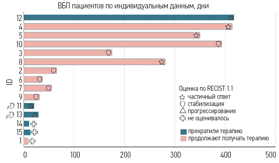 От причин, не связанных с лечением, умерли 3 пациента: 1 смерть наступила в результате развившегося желудочно-кишечного кровотечения (на фоне приема стероидных гормонов), летальный исход наступил, несмотря на частичный ответ после 3 курсов проведенной терапии (ID 11); 1 пациентка умерла от отека головного мозга на фоне лептоменингеального канцероматоза, объективно оценить динамику не удалось (ID 14); 1 смерть наступила в результате тромбоэмболии легочной артерии после 1-го курса терапии (ID 15). В результате прогрессирования злокачественного новообразования у пациентов произошло только 2 летальных исхода (ID 12 и 13).