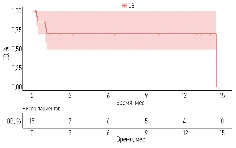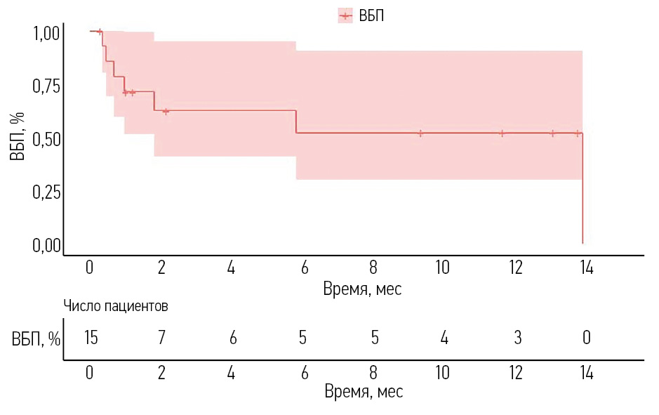 Следует отметить небольшой период наблюдения у части пациентов и в связи с этим – низкую медиану наблюдения в целом. В оценку в период с января по апрель 2023 г. включены 5 пациентов. Будет продолжен сбор ретроспективных данных с целью мониторинга оценки ВБП и ОВ в реальной клинической практике.