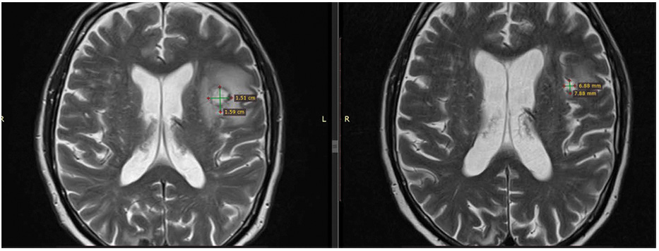 Fig. 6. Patient No.11, axial plane, comparison of contrast-enhanced brain MRI dated February 2022 (left) and April 2022 (right), reduction of the target lesion in the left parietal lobe.