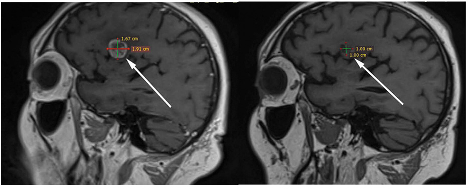 Fig. 7. Patient No.11, sagittal plane, comparison of contrast-enhanced brain MRI dated February 2022 (left) and April 2022 (right), reduction of the target lesion in the left parietal lobe.