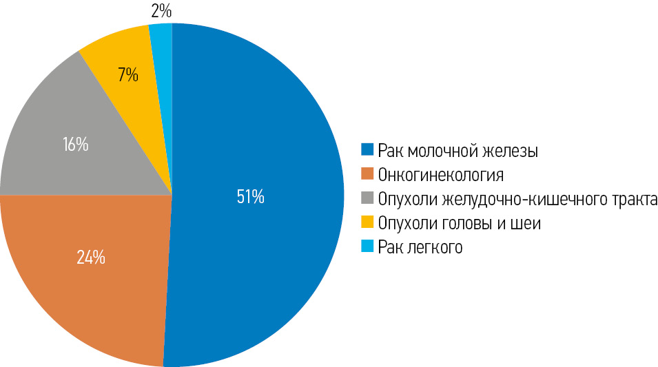 В настоящее время курсы лекарственного противоопухолевого лечения – один из основных терапевтических подходов в онкологии в качестве комбинированного или самостоятельного метода. Данный вид лечения очень часто сопровождается развитием осложнений, которые приводят к увеличению интервалов между курсами и, как следствие, снижению эффективности лечения [15]. Пандемия COVID-19, особенно на ранних этапах, привела к затруднению доступа пациентов, в том числе и онкологических, к ресурсам системы здравоохранения в связи с карантинными мероприятиями. По сообщениям пациентов, 39–54% из них испытали подобные трудности [16]. Кроме того, накопленный сегодня опыт свидетельствует о том, что у онкологических пациентов при развитии COVID-19 риск смертности (отношение шансов – ОШ 3,23, 95% доверительный интервал – ДИ 1,71–6,13), тяжелой/критической формы заболевания (ОШ 3,91, 95% ДИ 2,70–5,67), госпитализации в отделение интенсивной терапии (ОШ 3,10, 95% ДИ 1,85–5,17) и искусственной вентиляции легких (ОШ ,86, 95% ДИ 1,27–18,65) был выше, чем у неонкологических больных [17].