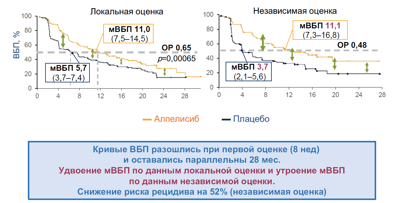 Эффективность алпелисиба у пациентов c мутацией PIK3CA (ВБП): продемонстрировано статистически значимое увеличение мВБП (удвоение мВБП по данным локальной оценки и утроение мВБП по данным независимой оценки); кривые ВБП разошлись при первой оценке (8 нед) и оставались параллельны в течение 28 мес; наблюдалось снижение относительного риска (ОР) рецидива на 52% (независимая оценка); рис. 5 [33]. Таким образом, у пациентов с мутацией гена PIK3CA в опухоли при использовании комбинации фулвестранта с алпелисибом ОР прогрессирования болезни снижался более чем в 2 раза.