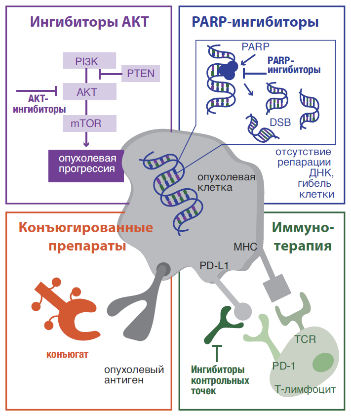 PARP-ингибиторы – это группа препаратов, которая усугубляет дефицит гомологичной рекомбинации, который и так присутствует у пациентов с мутацией BRCA, приводя к гибели опухолевой клетки. На данный момент в РФ зарегистрировано два препарата, которые могут применяться у пациентов с мРМЖ и наличием мутаций в генах BRCA1/2: олапариб и талазопариб.