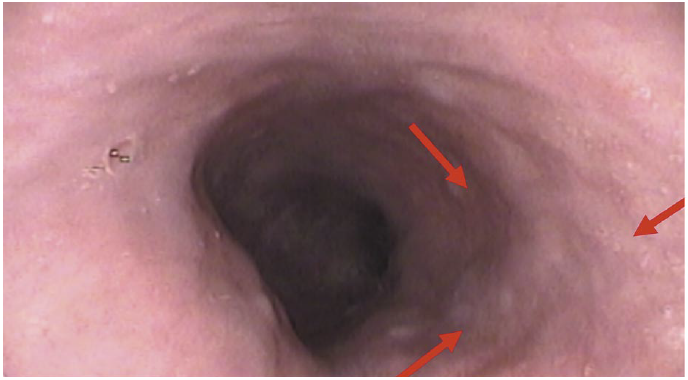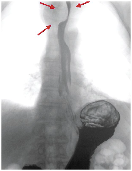 Пациент И., 72 г. Из анамнеза известно, что с 1999 г. выявлена язвенная болезнь ДПК. Проводилась консервативная терапия с положительной динамикой без последующего наблюдения. Клинические симптомы обострения отмечал давно. В 2014 г. появились жалобы на периодическую изжогу. Самостоятельно принимал антисекреторные препараты с клинически положительным эффектом, с последующей самостоятельной отменой. С марта 2017 г. жалобы на изжогу приобрели постоянный характер, в связи с чем проведена эзофагогастродуоденофиброскопия (ЭФГДС). Выявлена язва пищевода, рубцовая деформация луковицы ДПК. С марта по декабрь 2017 г. проведена терапия ингибиторами протонной помпы, антацидами без выраженного положительного эффекта, после чего пациент вновь пропал из поля зрения специалистов. В январе 2018 г. появились периодические жалобы на затруднение при глотании твердой пищи, чувство кома в горле. При повторной ЭФГДС выявлены хронические язвы нижней трети пищевода до 4 см, эрозивный дуоденит, рубцовая деформация луковицы ДПК. По данным биопсии – картина полной тонкокишечной метаплазии. Helicobacter pylori (-). Далее пациенту выполнена рентгенография желудочно-кишечного тракта с барием. Выявлено образование до 5 см в средостении, сдавливающее пищевод. Рубцовая деформация пищевода, подозрение на язву пищевода. Скользящая кардиофундальная грыжа пищеводного отверстия диафрагмы. Гастроптоз. Рубцовая деформация луковицы ДПК. Гипертонус ДПК (рис. 1). От предложенного выполнения мультиспиральной компьютерной томографии (КТ) на тот момент отказался.
