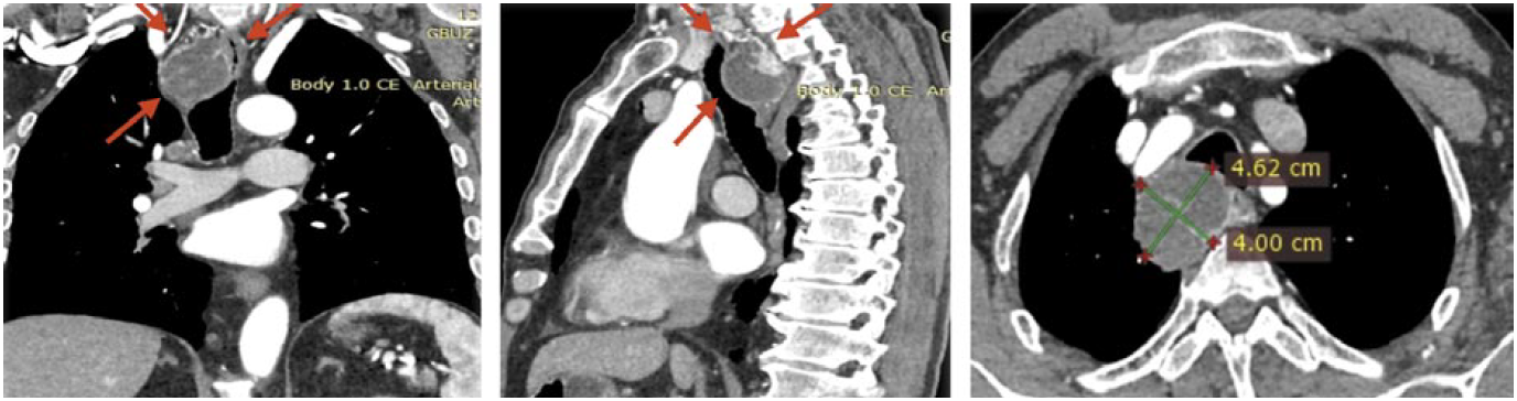 При мультиспиральной КТ с болюсным усилением по нижнему краю правой доли щитовидной железы в заднем верхнем средостении визуализируется кистозно-солидное объемное образование с четкими ровными контурами размером 46×38×48 мм, прилежит и деформирует заднюю стенку трахеи и правую боковую стенку пищевода. Солидный компонент накапливает контрастное вещество аналогично ткани щитовидной железы, определяются тонкие перегородки, накапливающие контрастное вещество. Окружающая клетчатка уплотнена (рис. 3).