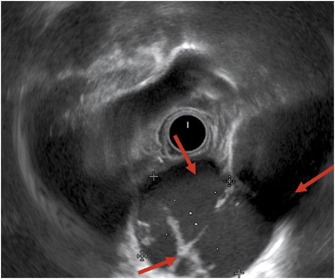 Рис. 4. Эндосонографическая картина кистозно-солидного новообразования верхнего средостения.