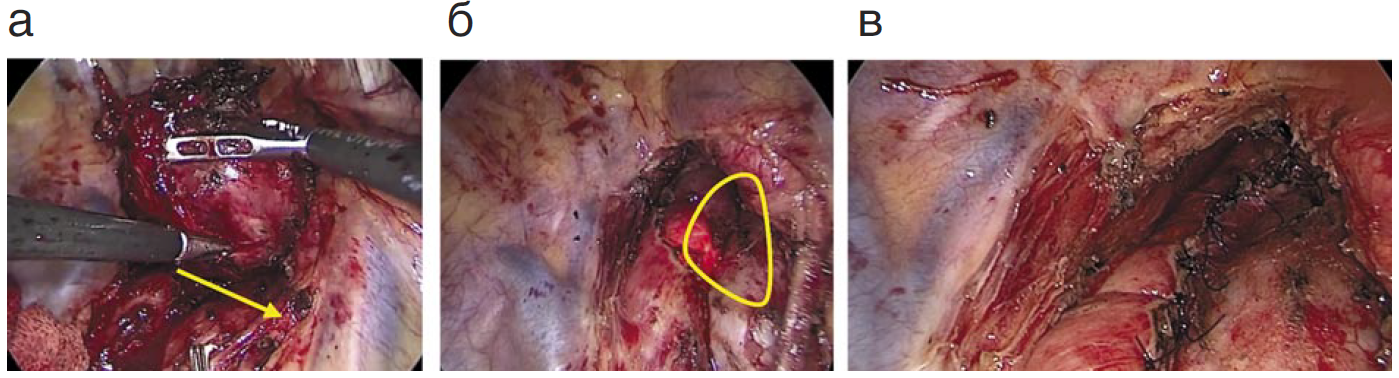 Рис. 7. Интраоперационная картина: а – блуждающий нерв, б – дефект мышечного слоя пищевода, в – ушивание мышечного слоя пищевода.