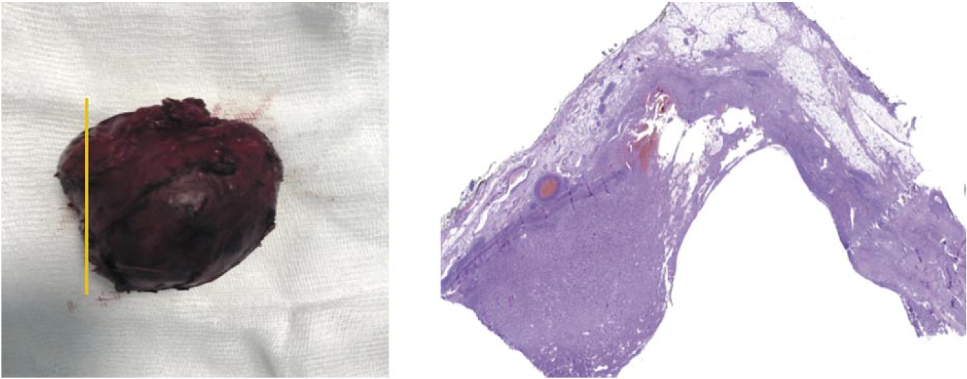 При макроскопическом исследовании опухоль представлена серым эластичным узлом размером 5,0×5,0×4,0 см. На разрезе опухоль кистозного вида с гладкой внутренней поверхностью и наличием тонкостенных перегородок. В просвете кистозных полостей содержится кровянистая жидкость. Толщина стенок кистозной опухоли на большем протяжении составляет 0,3–0,5 см с наличием участка утолщения до 1,0 см (рис. 8). К наружной поверхности опухолевого узла с одной из сторон плотно прилежит резецированный фрагмент мышечного слоя стенки пищевода размером 4,0×4,0 см.