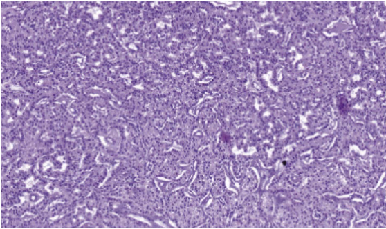 Рис. 9. Рак паращитовидной железы. Опухоль состоит из главных клеток, формирующих солидные, ацинарные и трабекулярные структуры. Окраска гематоксилин-эозином, ×100.