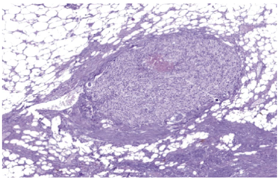 Рис. 10. Рак паращитовидной железы. Экстракапсулярная инвазия опухоли в прилежащую клетчатку. Окраска гематоксилин-эозином, ×50.