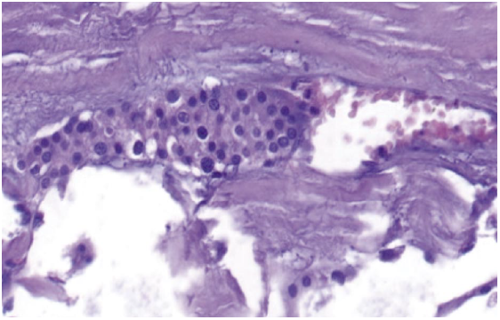 Рис. 11. Рак паращитовидной железы. Опухолевые комплексы в просвете мелкого венозного сосуда. Окраска гематоксилин-эозином, ×200.