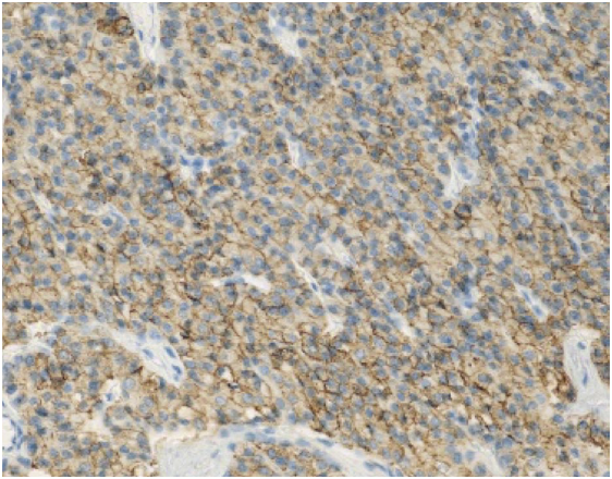 Рис. 12. Рак паращитовидной железы. Диффузно-позитивная мембранно-цитоплазматическая экспрессия ПТГ в опухолевых клетках. Иммуногистохимическое исследование с антителами к ПТГ, ×200.