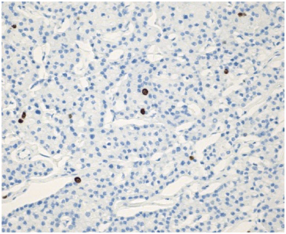 Рис. 13. Рак паращитовидной железы. Низкая пролиферативная активность опухоли. Иммуногистохимическое исследование с антителами к Ki-67, ×200.