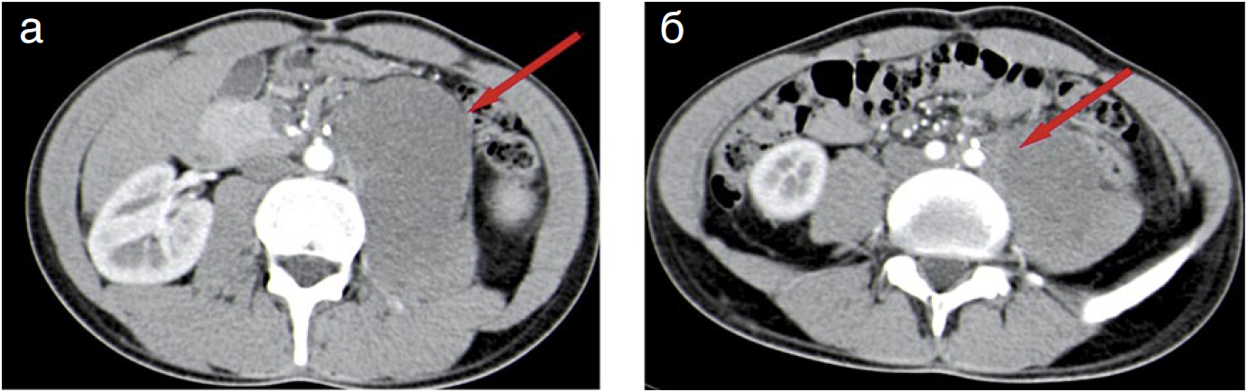 Рис. 1. Пациент C., 24 года. КТ. Аксиальные срезы. Артериальная фаза. Забрюшинно слева определяется практически аваскулярная опухоль с неровными, частично четкими контурами, инфильтрирующая левую поясничную мышцу (а), окружающая левую подвздошную артерию (б) – указано стрелками.