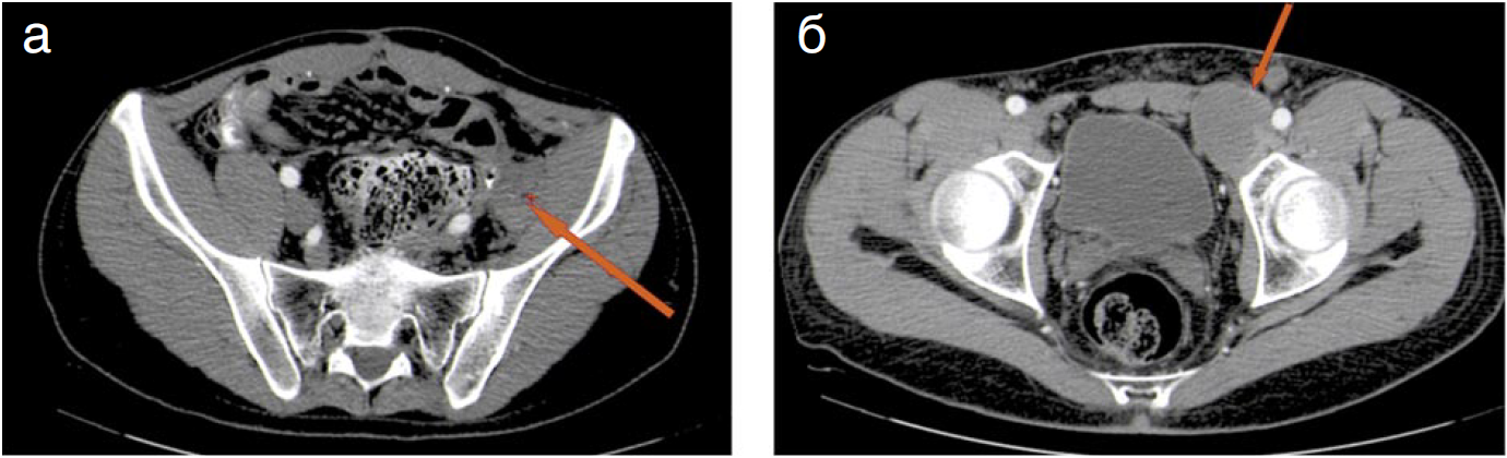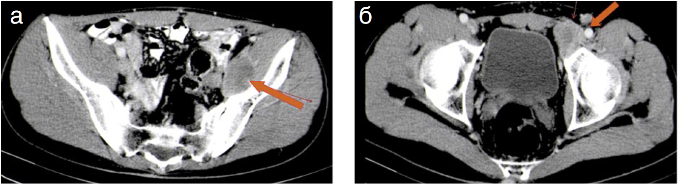 Рис. 3. Пациент C. через 9 мес после выявления 1-го рецидива (18 мес после операции). КТ. Аксиальные срезы. Артериальная фаза. По ходу левой наружной подвздошной артерии (а) и в паховом канале (б) определяются рецидивные гиповаскулярные опухолевые узлы округлой формы с частично четкими контурами, увеличенные в размерах по сравнению с предыдущим исследованием.