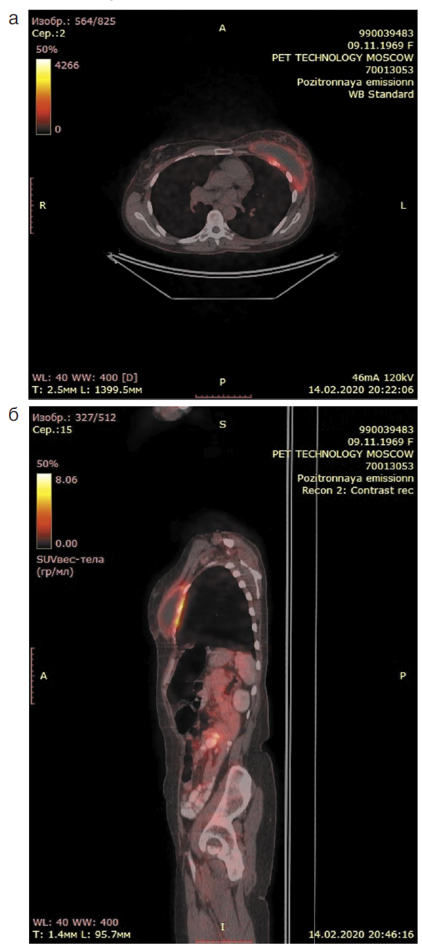 По данным комбинированной позитронно-эмиссионной и рентгеновской компьютерной томографии (ПЭТ-КТ) от 14.02.2020 слева под МЖ и грудной мышцей определяется структура жидкостной плотности с плотной капсулой с SUV 4.19 и в левой аксиллярной области – лимфатический узел до 20 мм с гиперфиксацией радиофармпрепарата. По капсуле вышеописанной структуры картина патологической активности от передних отрезков IV–V ребер слева (рис. 2).