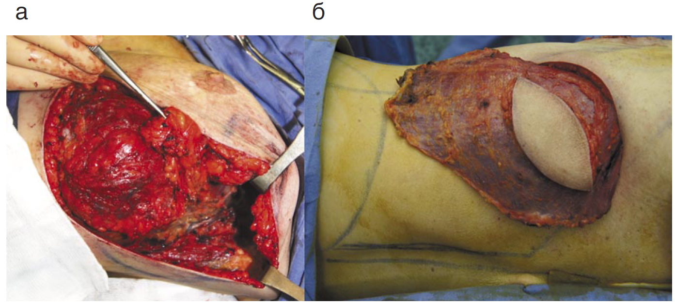 В положении больной на спине согласно предварительной разметке (рис. 3) дугообразным разрезом по субмаммарной складке с продолжением в подмышечную область рассечена кожа, подкожная жировая клетчатка передней грудной стенки слева (рис. 4, а). МЖ отсепарована от подлежащих тканей (рис. 4, б), составляющих плотный конгломерат без четких контуров. Выделены край большой грудной мышцы, подмышечная вена, прослежен ход подлопаточных, торакодорзальных сосудов (рис. 5, а). Выполнена подмышечная ЛАЭ с сохранением сосудистой ножки широчайшей мышцы спины (ШМС). В положении больной на правом боку в проекции ШМС слева от задней подмышечной до паравертебральной линии двумя полуовальными разрезами длиной ~10 см рассечены кожа, подкожная клетчатка. Выделен кожно-подкожно-жировой лоскут на ШМС, лоскут мобилизирован для укрытия дефекта передней грудной стенки слева (рис. 5, б). Следующим этапом выполнена блоковая резекция грудной стенки с фрагментами III–V ребер. Учитывая распространенность процесса (интимное прилегание опухолевого конгломерата к участку IV сегмента левого легкого), выполнили атипичную резекцию верхней доли левого легкого (рис. 6). Удаленный препарат представлен на рис. 7. В последующем выполнена многокомпонентная пластика дефекта передней грудной стенки: с целью восстановления герметичности плевральной полости произведено укрытие двумя биоимплантатами Permacol размерами 10×15 см с подшиванием к краям дефекта; реберный каркас восстановлен путем имплантации протезов Codubix Ribs (рис. 8, а). Торакодорзальный лоскут деэпидермизирован и перемещен через подкожный тоннель в область дефекта передней грудной стенки, фиксирован к подлежащим тканям узловыми швами (рис. 8, б). МЖ фиксирована поверх лоскута в исходном положении. Рана послойно ушита. Вид пациентки на операционном столе представлен на рис. 8, в.