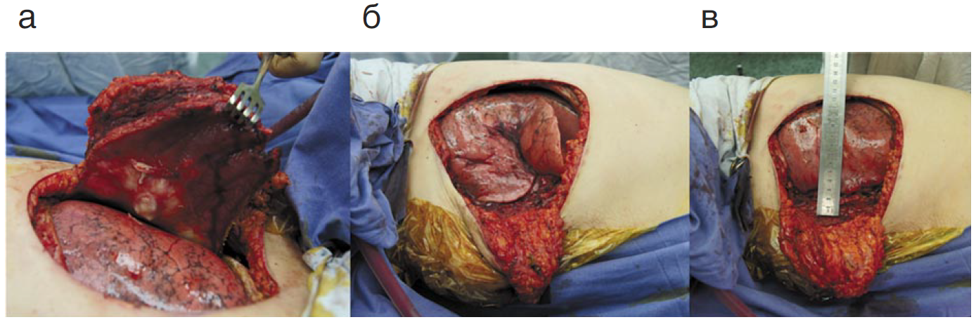 Рис. 6: а – удаляемый препарат интимно прилежит к верхней доле легкого; б, в – вид после блоковой резекции ребер и атипичной резекции легкого.